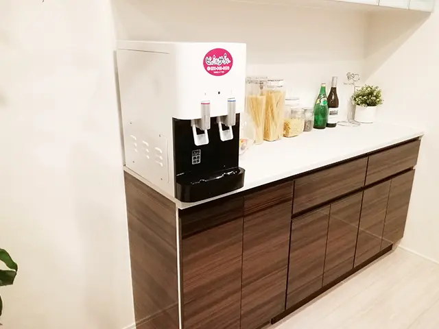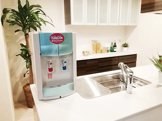 水道直結型のウォーターサーバー。 高性能なフィルターで水道水をろ過し、冷水・温水・常温水を提供。 ボトル交換の手間がなく、また水道直結型なので水がなくなることもなく安心して利用できる。環境に配慮した設計で、家庭やオフィスでの利用に適している。